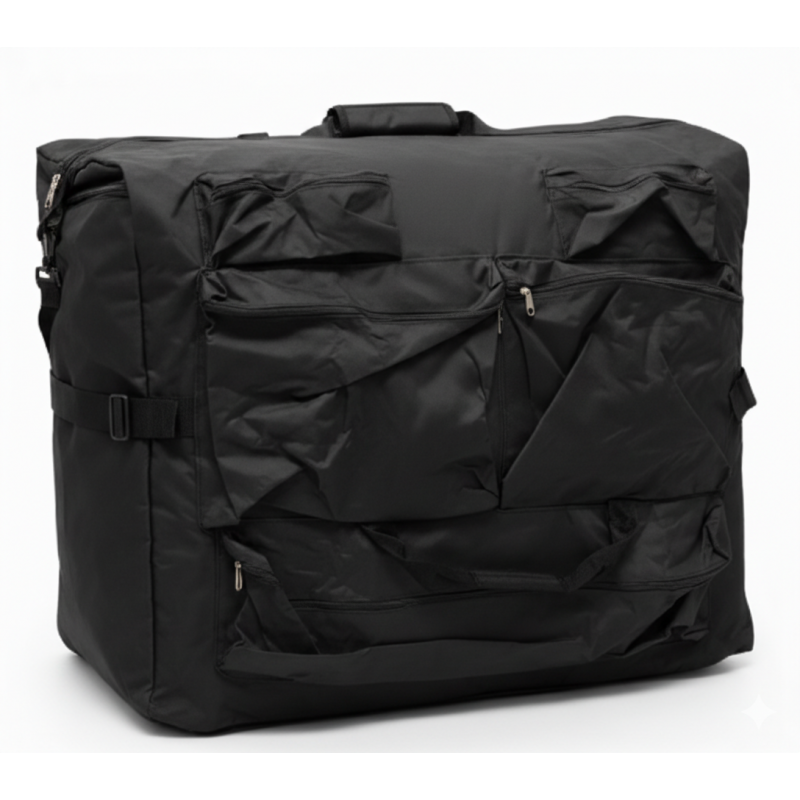 Housse de Transport solide en nylon pour Tables de Massage Pliantes, avec une bandoulière et des pochettes latérales pour ranger vos accessoires (linge, coussins, huiles...), très utile lors de vos déplacements à domicile !