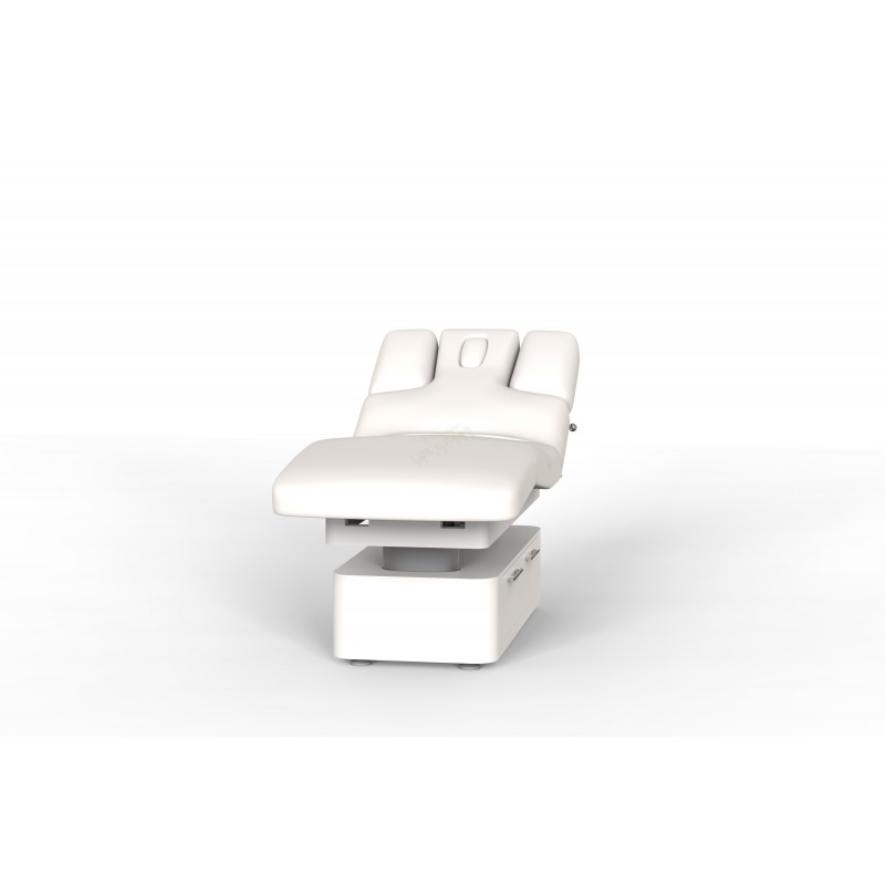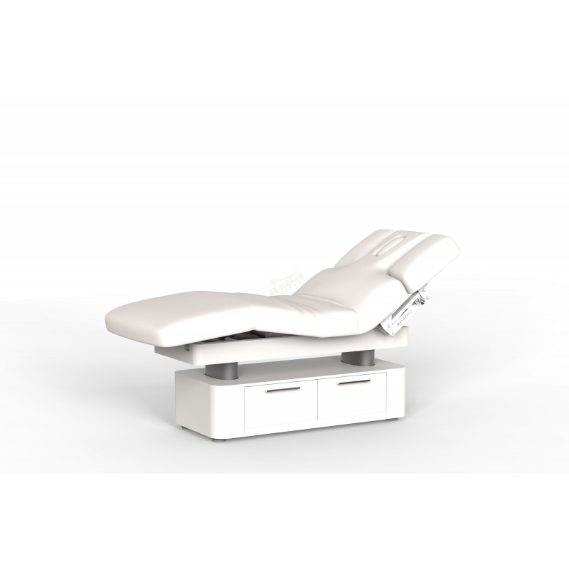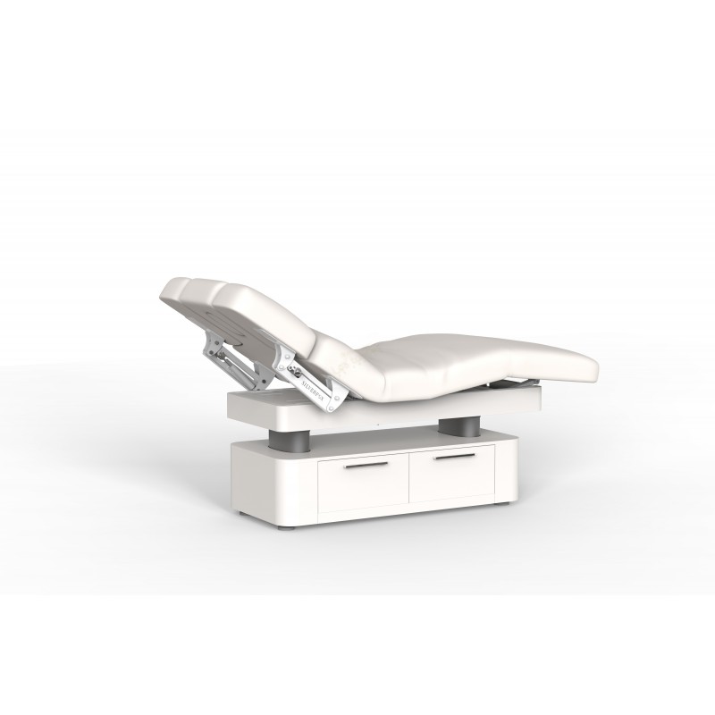 4 moteurs : combine réglages entièrement électriques, chauffage intégré et mémoires de position pour gagner du temps entre deux clientes. l’éclairage LED au socle apporte une ambiance premium en cabine. Le plan 199×79 cm repose sur une mousse 12 cm au revêtement PU blanc facile d’entretien ; la base bois blanc signe une esthétique soignée. Armoire sous plan à 2 tiroirs : vos consommables restent à portée.