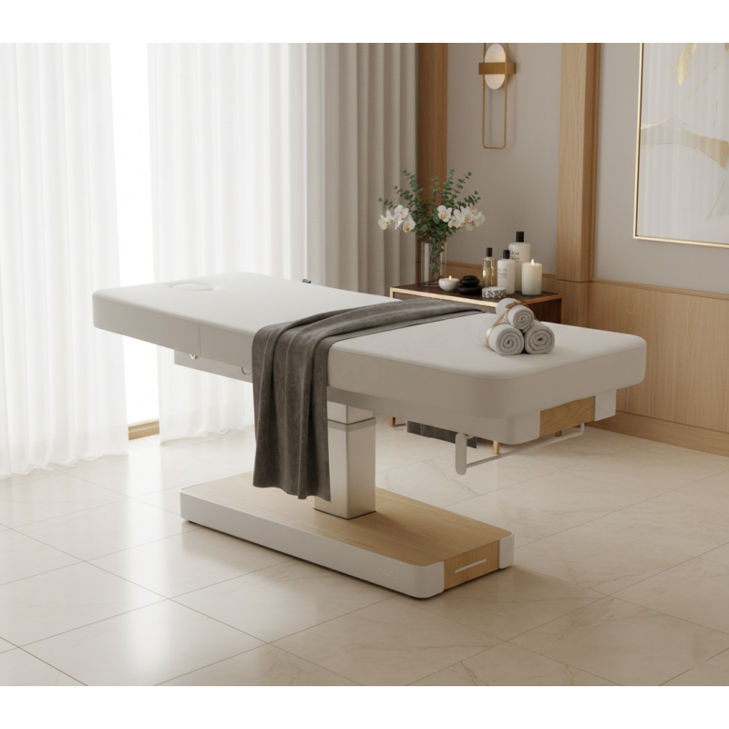 Son matelas monobloc ultra-confortable de 13 cm, revêtu de PU blanc sans coutures, offre un toucher doux et une hygiène parfaite. La base en bois naturel avec éclairage LED intégré crée une atmosphère chaleureuse et relaxante dans chaque cabine de soin.