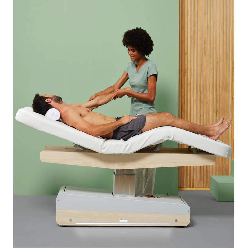 Offrez à vos clients une expérience haut de gamme avec cette table électrique 3 moteurs Spa – la Swop S3 Starter de Naggura. Réglable en hauteur (62-88 cm) et inclinable au niveau du torse et des genoux, elle garantit un confort absolu. Son matelas large de 75 cm, revêtu du vinyl Naggura Skin résistant, s’inscrit dans un design élégant aux finitions bois. Le système LED, les panneaux décoratifs interchangeables et le système audio Bluetooth en option lui confèrent une touche premium qui valorise votre espace de soin ou institut.
